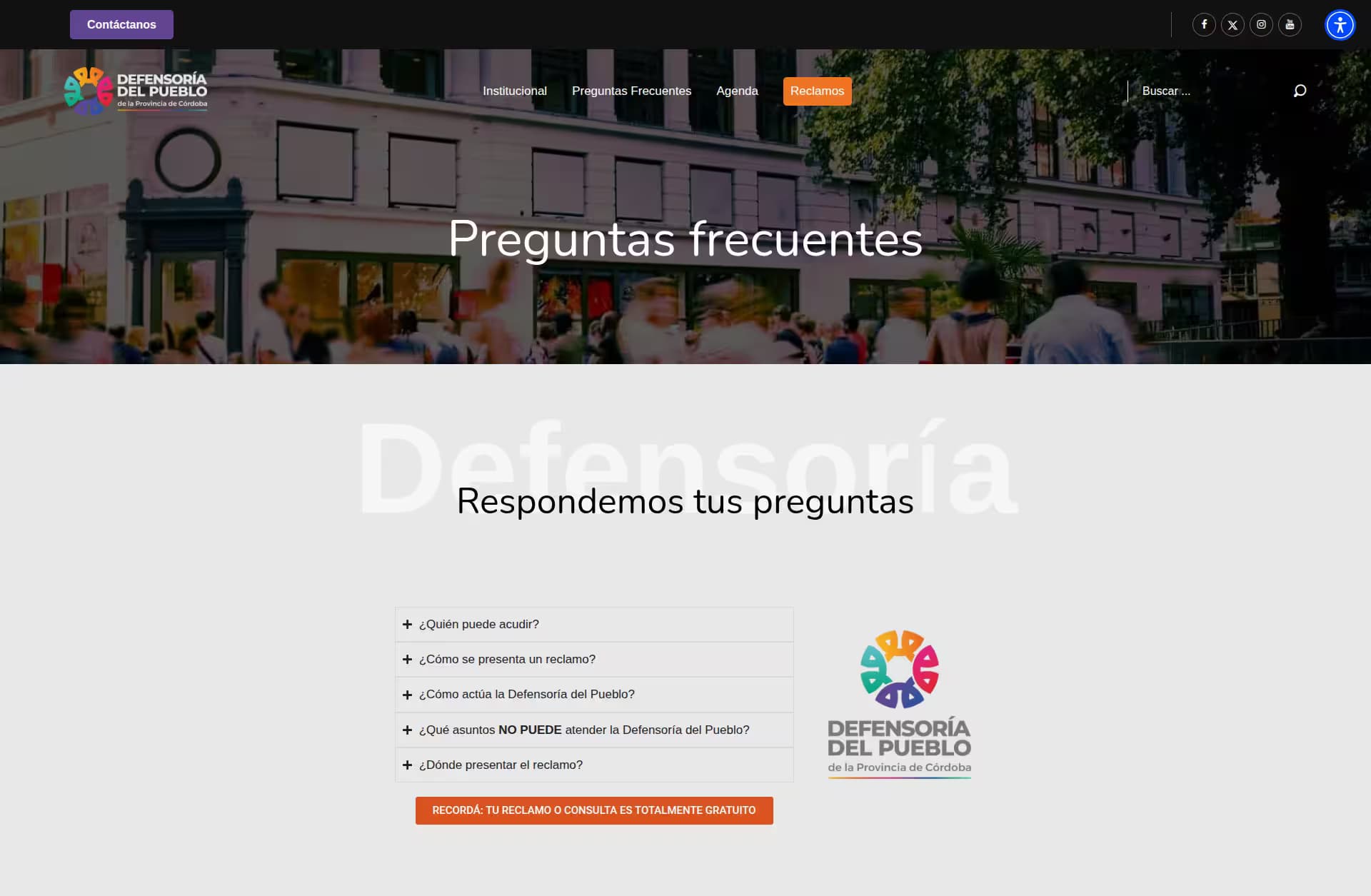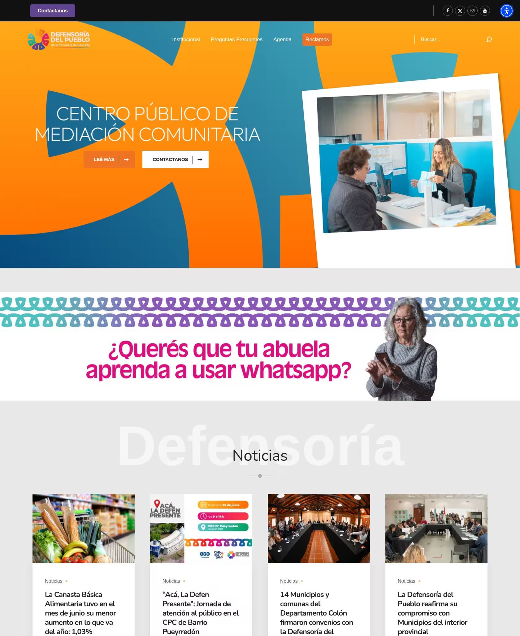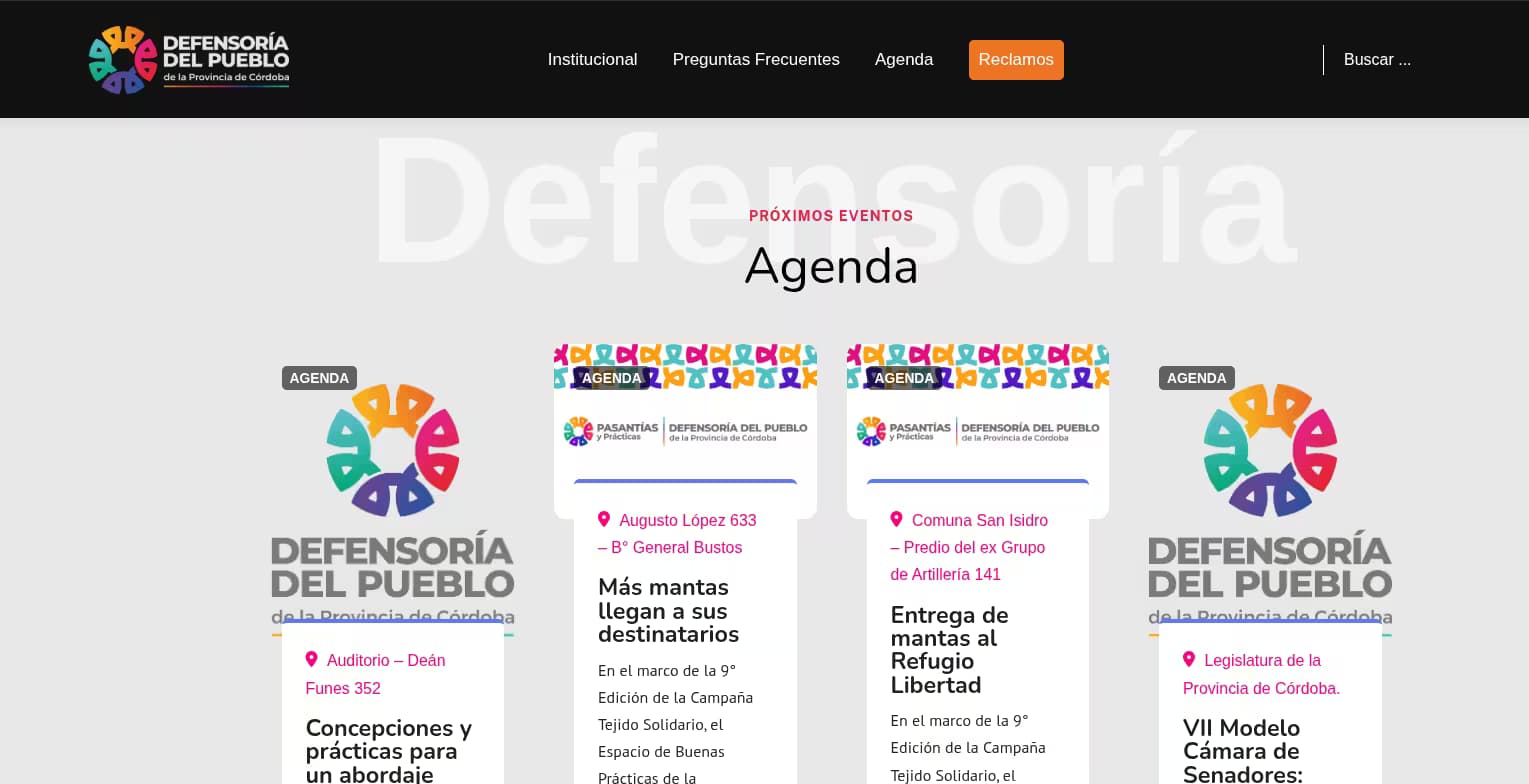 WordPress, js, css y custom code para el sirio de la Defensoría del Pueblo de la Provincia de Córdoba. Desarrollo estético y funcional para reclamos de ciudadanos. Agenda y calendario de eventos.
